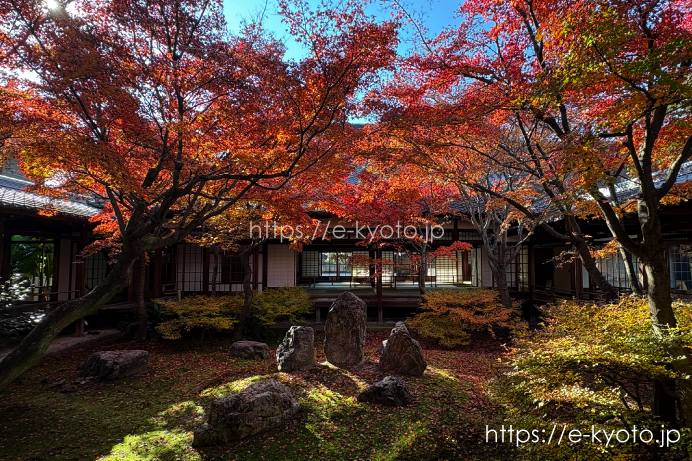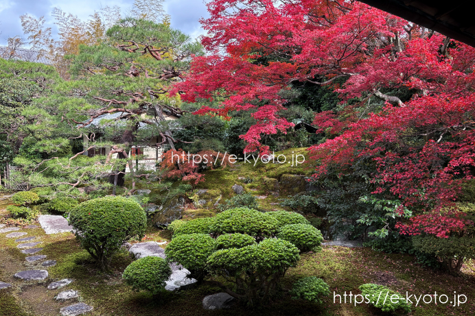 圓徳院の紅葉の見頃は、例年11月中旬から12月上旬頃です。拝観境内には約100本のモミジがあり、特に北書院から眺める北庭の枯山水庭園と紅葉が人気のスポットとなっています。