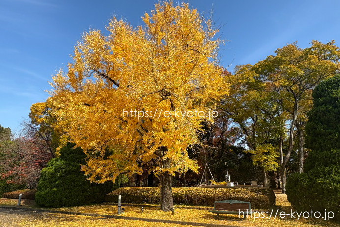 京都御苑では、例年11月下旬から12月上旬にかけて、銀杏が見頃を迎えます。苑内にはおよそ20本の大きな銀杏が植えられており、なかでも一条邸跡の銀杏や凝華洞跡の銀杏、そして学習院発祥の地とされる場所にそびえる銀杏がとりわけよく知られています。