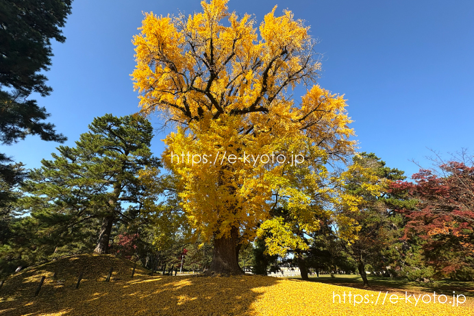 二条城の銀杏は、例年11月下旬頃に見頃を迎えます。城内にはおよそ20本の銀杏が植えられており、本丸西橋近くに立つ標本木の銀杏や、「桜の園」に広がる銀杏並木は、とくに多くの方々に親しまれています。