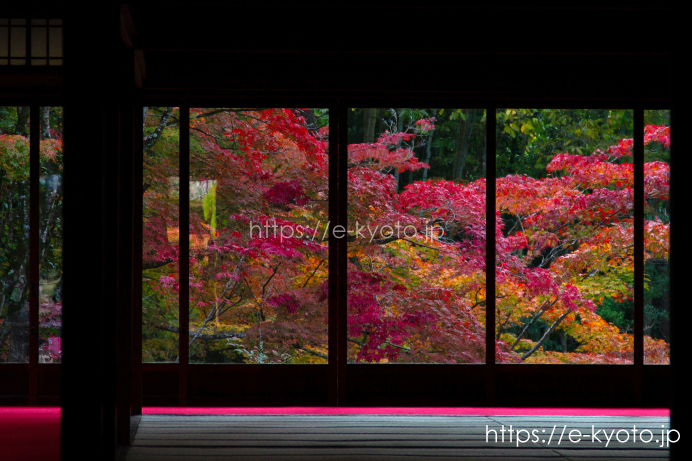 詩仙堂の紅葉の見頃は、例年11月上旬から中旬頃です。開放された書院から眺める庭園では、紅葉したモミジと刈り込まれた緑のコントラストが美しく、詩仙堂の紅葉を代表する絶景スポットとなっています。
