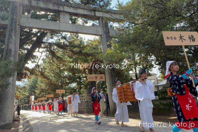 先頭の神職さんがお祓いを済ませると、行列がゆっくり歩き出します。茶摘み娘たちは、茶葉の産地が書かれた板を持って進んでいきます。産地は木幡・宇治・菟道・伏見桃山・小倉・八幡・京都・山城。茶葉が入った茶壷は、唐櫃(からびつ)に入れられて、白装束の男性が二人がかりで運んでいました。