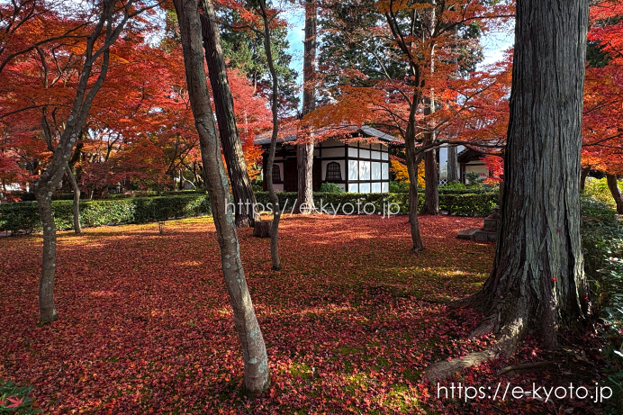 真如堂といえば紅葉の名所として有名ですが、実は“2度”紅葉を楽しめる場所。1度目は赤く色づく頃、そして2度目は落葉したモミジが地面を染める季節です。